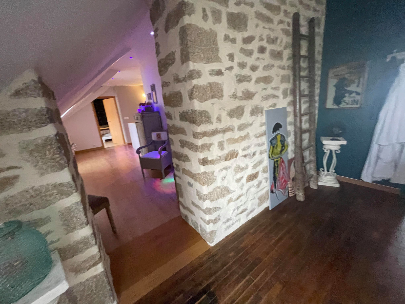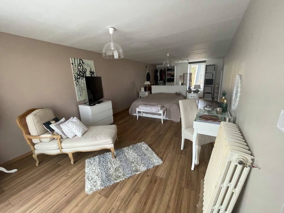 - à l'étage : un salon, deux chambres communicantes dont une suite parentale de 37m2, une salle de bain avec baignoire et douche.
