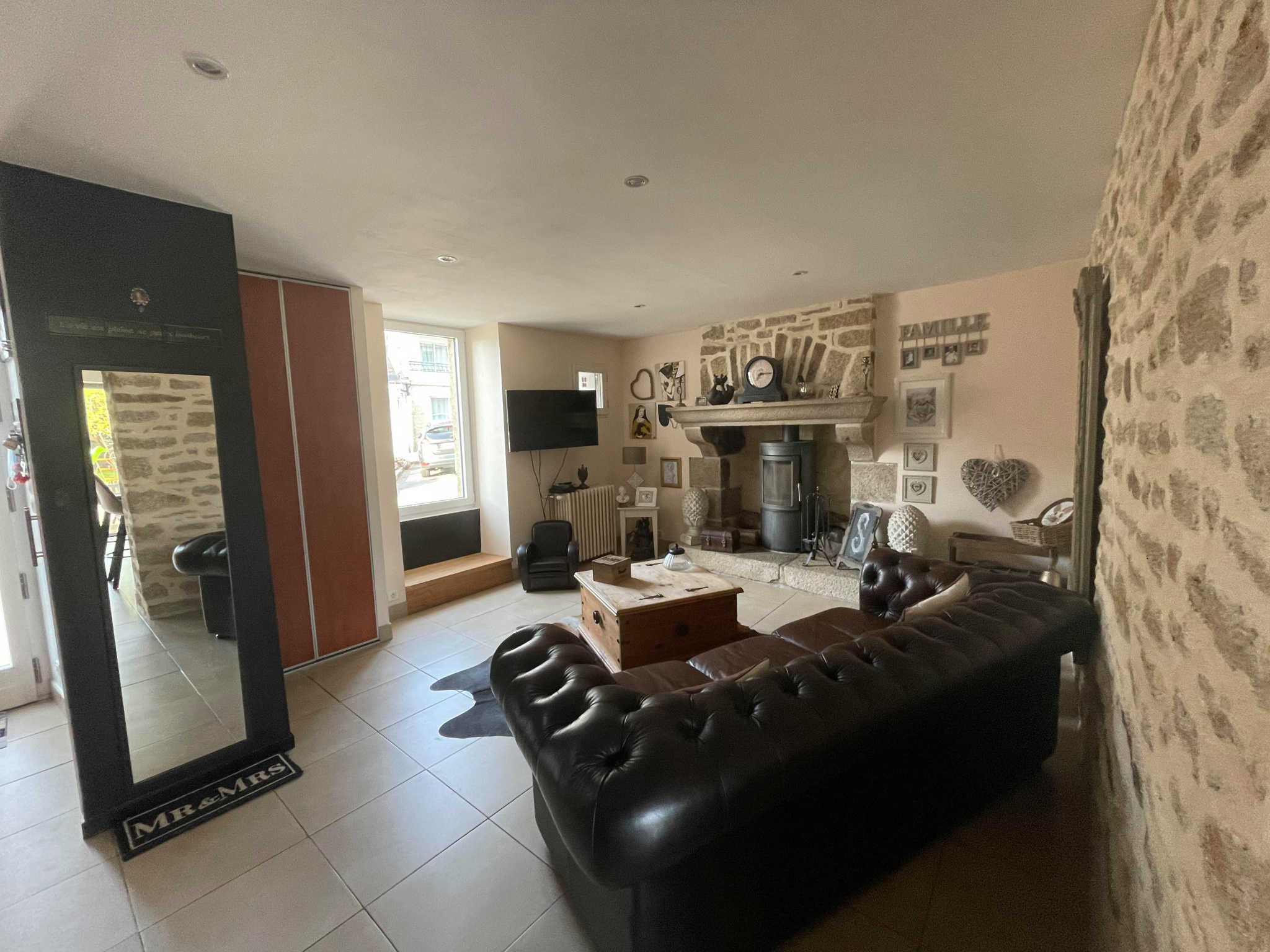 - Au rez-de-Chaussée : un hall d'entrée désservant une cuisine aménagée et équipée, ouverte sur la salle à manger, un salon équipé d'un poêle à bois encastré dans une très belle cheminée, une chambre avec douche et WC indépendants