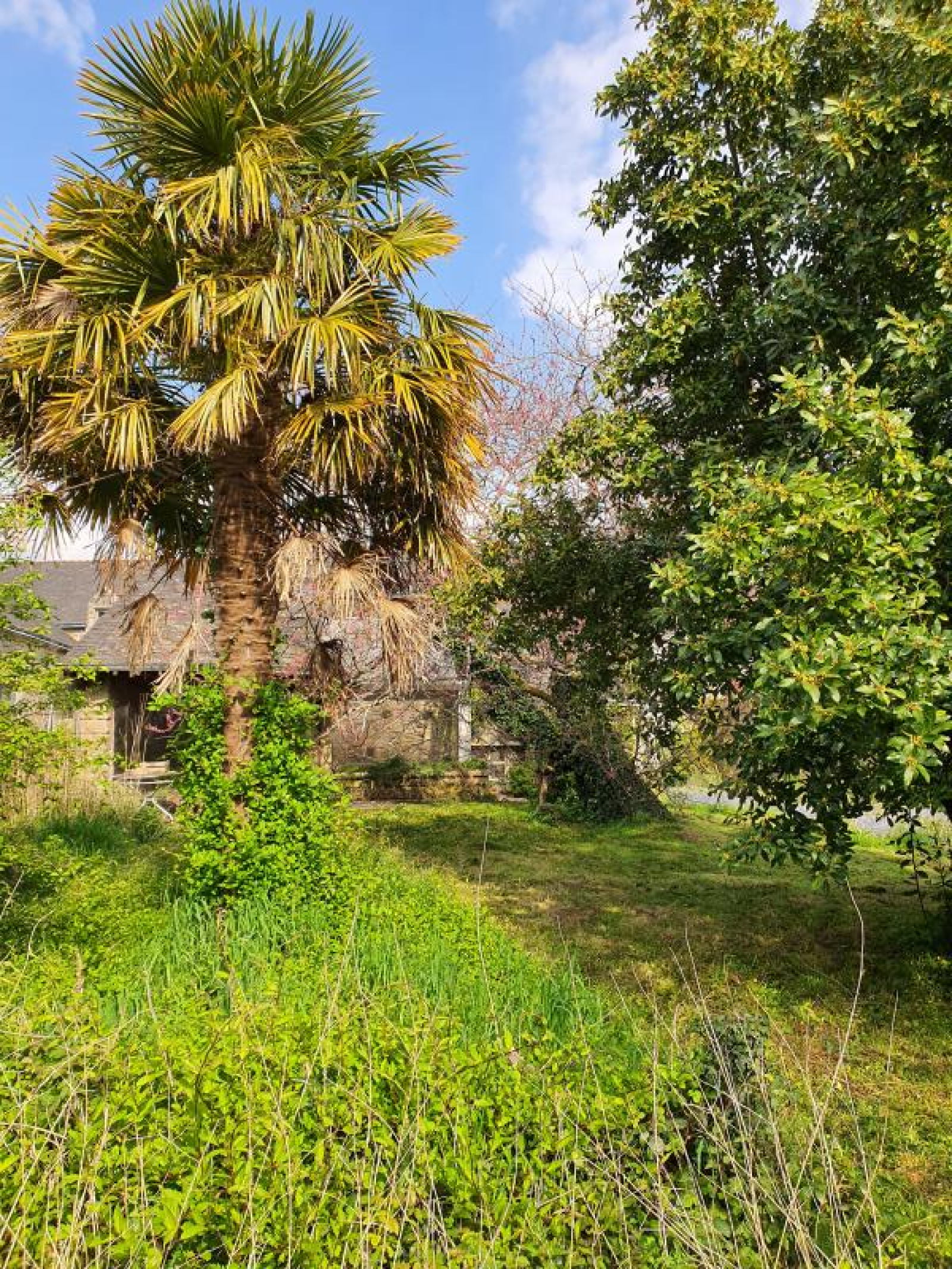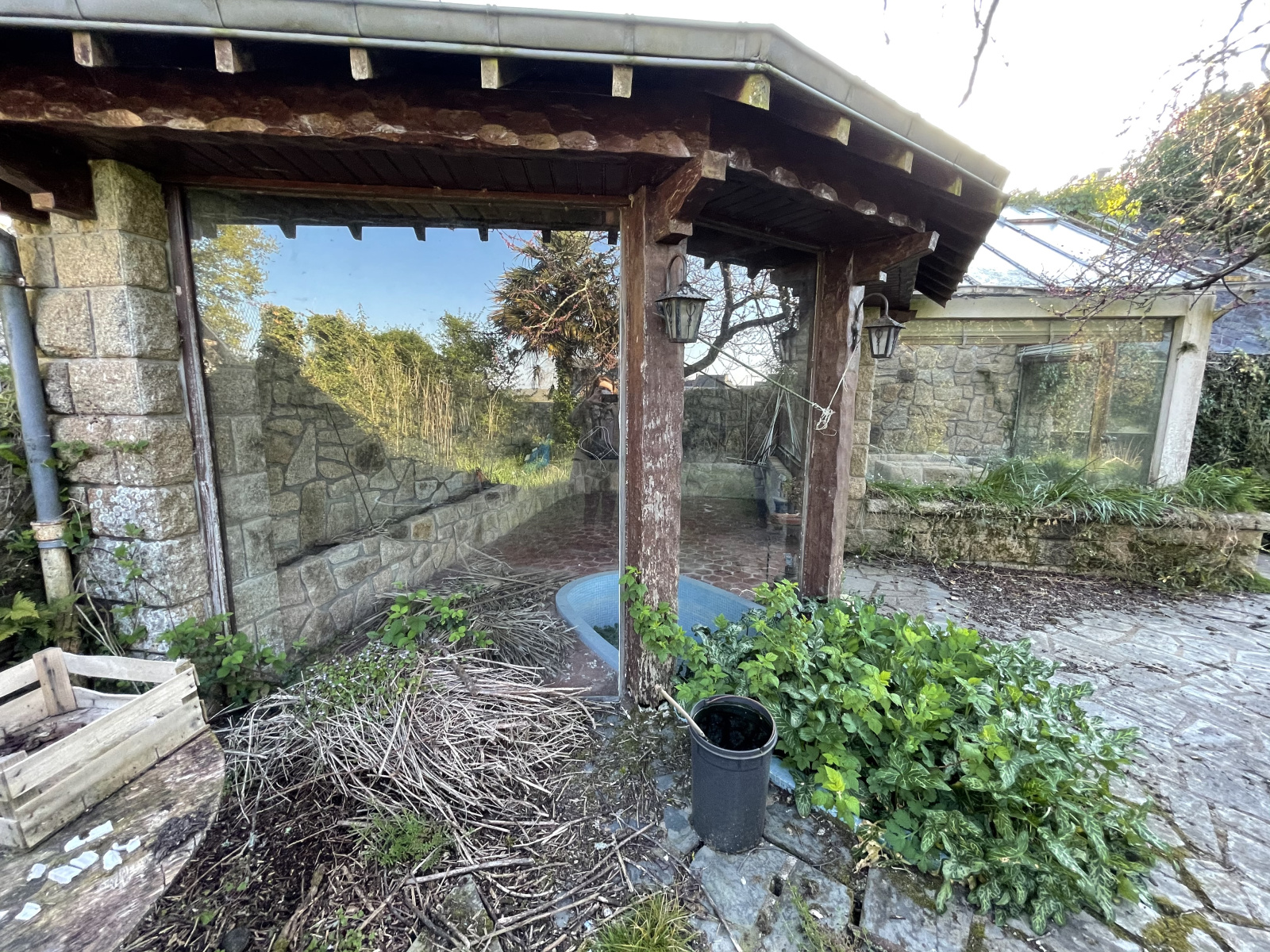un grand jardin avec une véranda et une serre à rénover