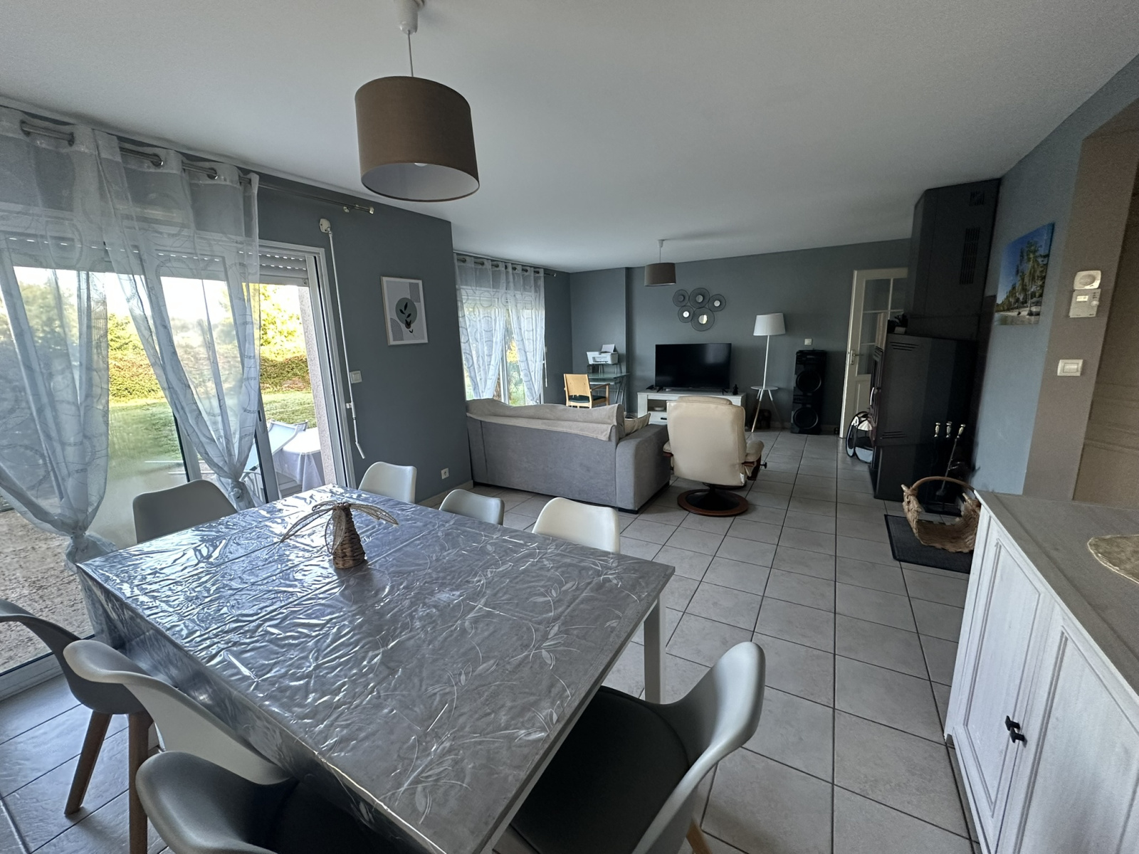 Au rez-de-chaussée : une entrée, une belle pièce de vie lumineuse avec salon et salle à manger, agrémentée d’un poêle à bois, une cuisine ouverte conviviale, un cellier, un garage attenant, une chambre, une salle de bains et un WC séparé.