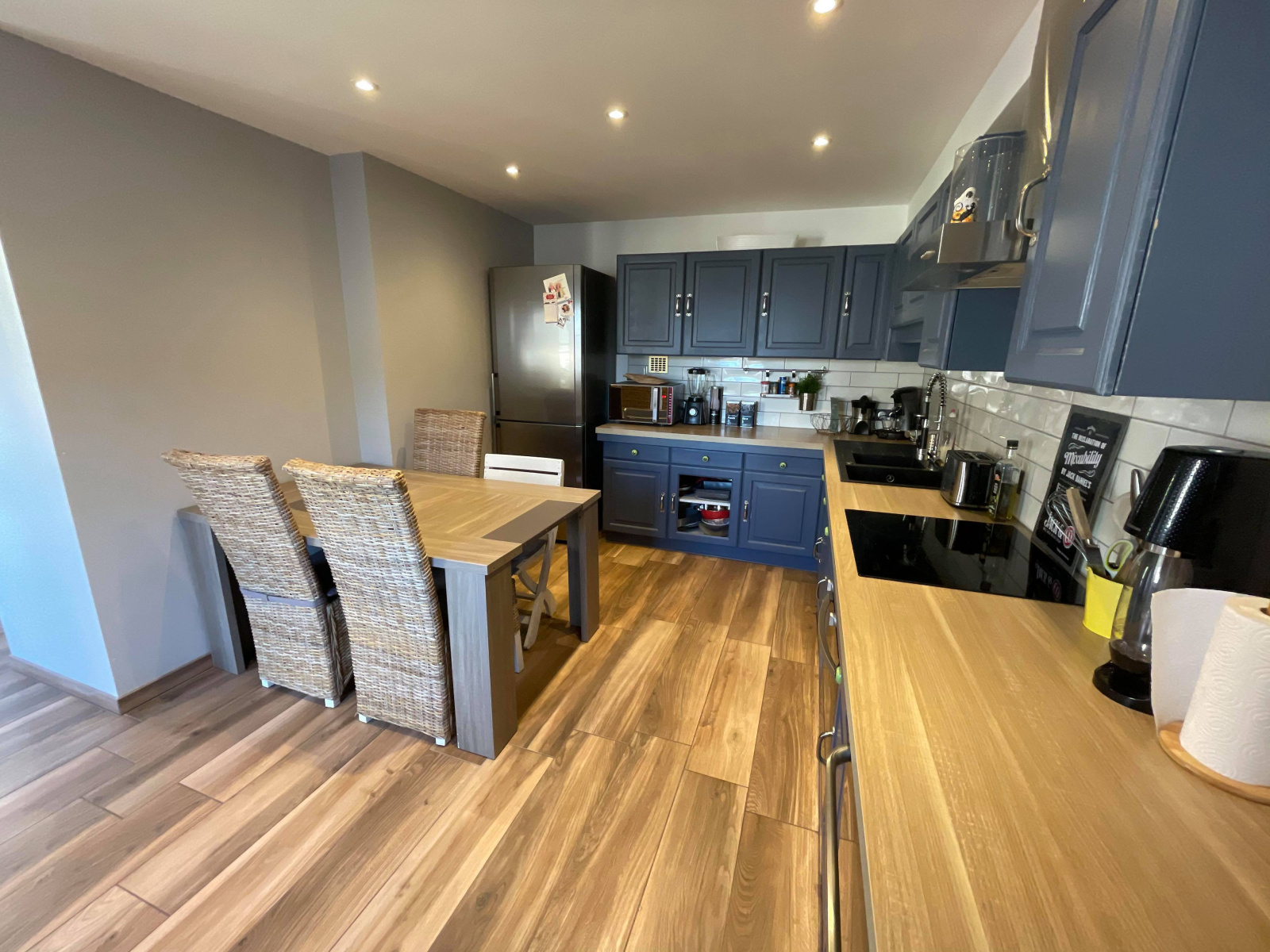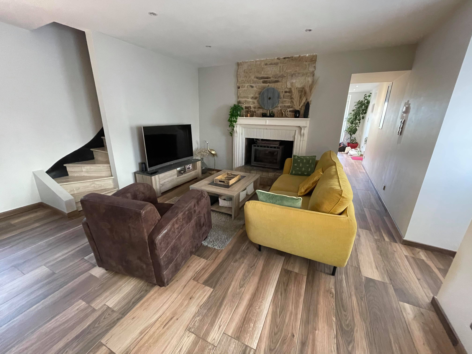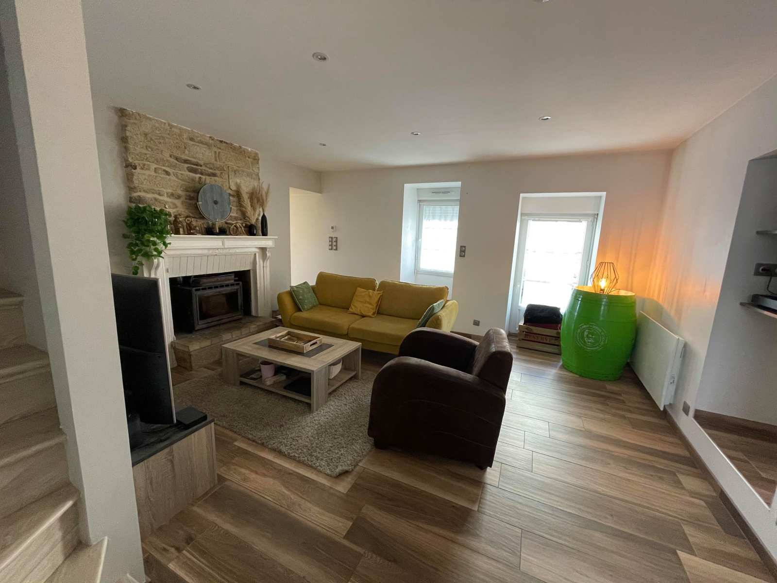 Au rez-de-chaussée : une cuisine aménagée et équipée sur un séjour lumineux dont un salon avec cheminée,