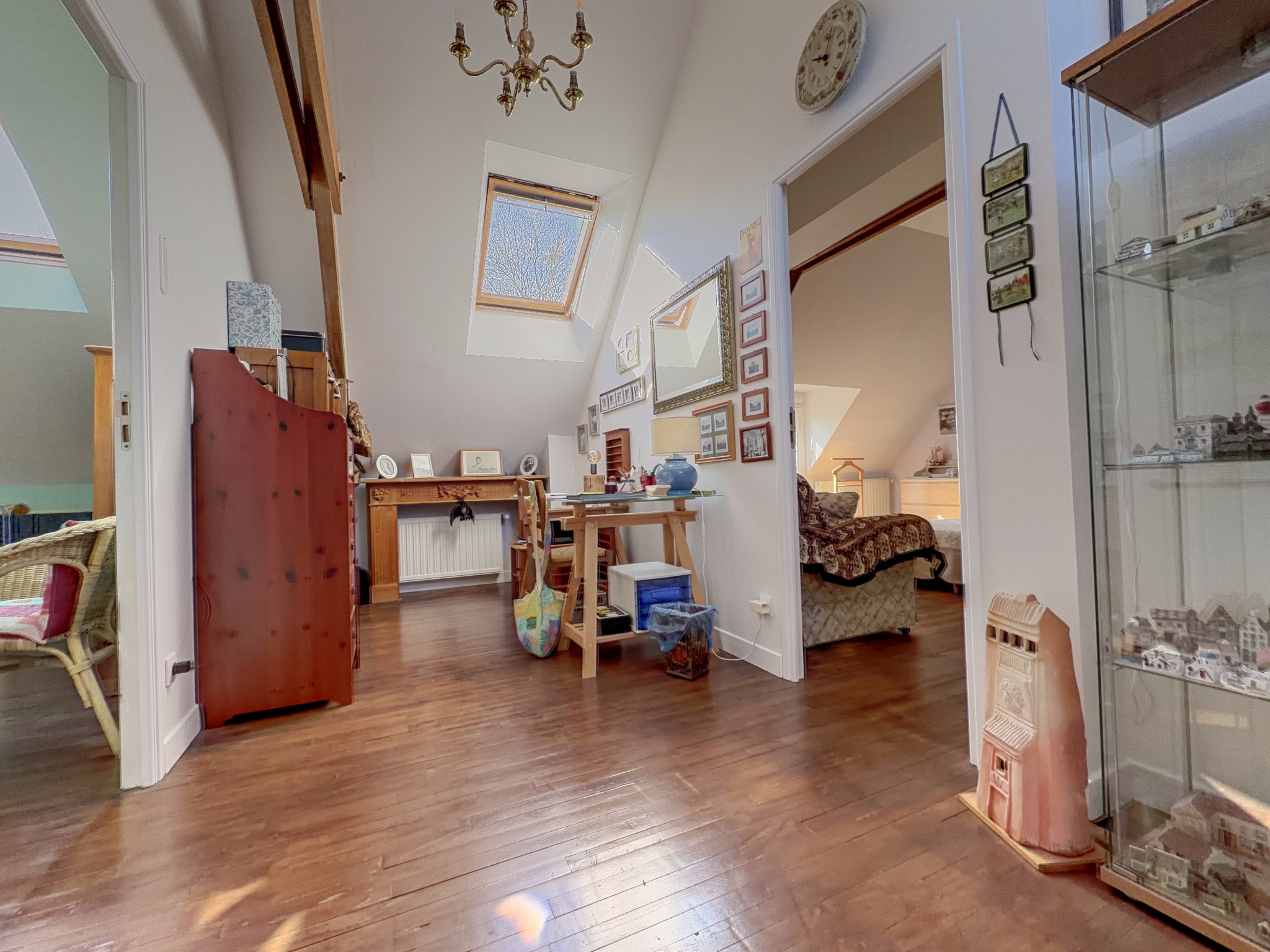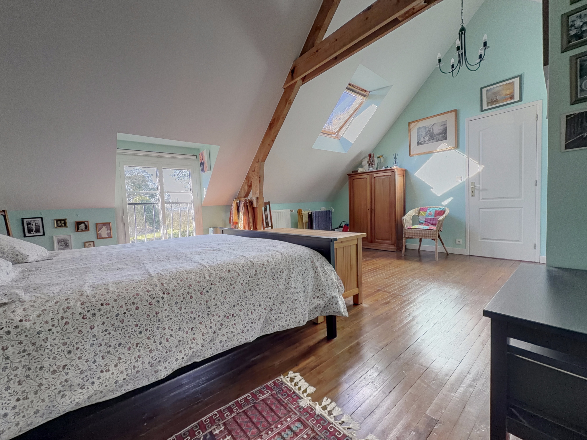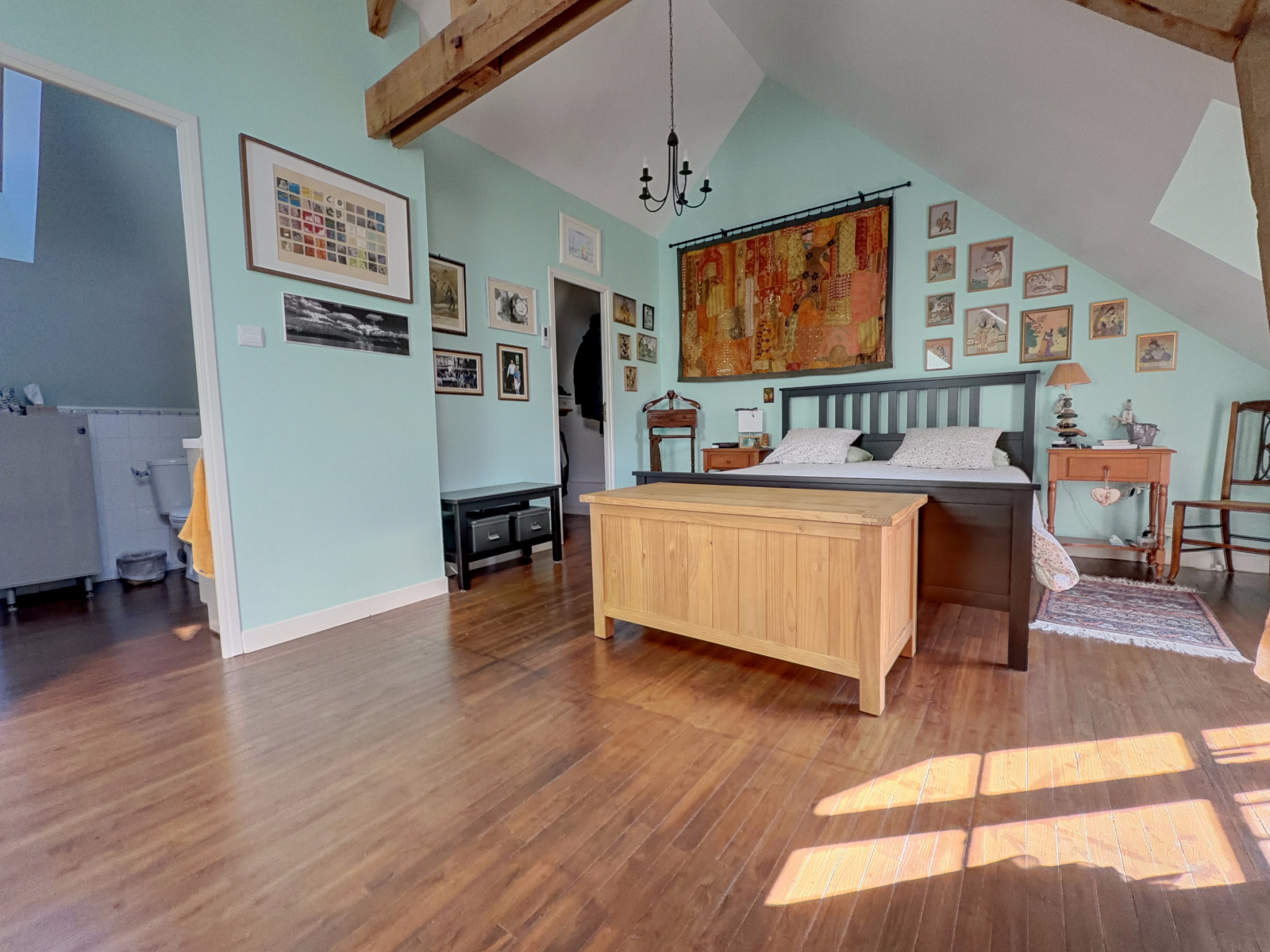 À l’étage, une mezzanine dessert deux belles chambres, chacune disposant de son dressing et de sa salle de bain privative, offrant confort et intimité. Un grenier vient compléter cet espace.