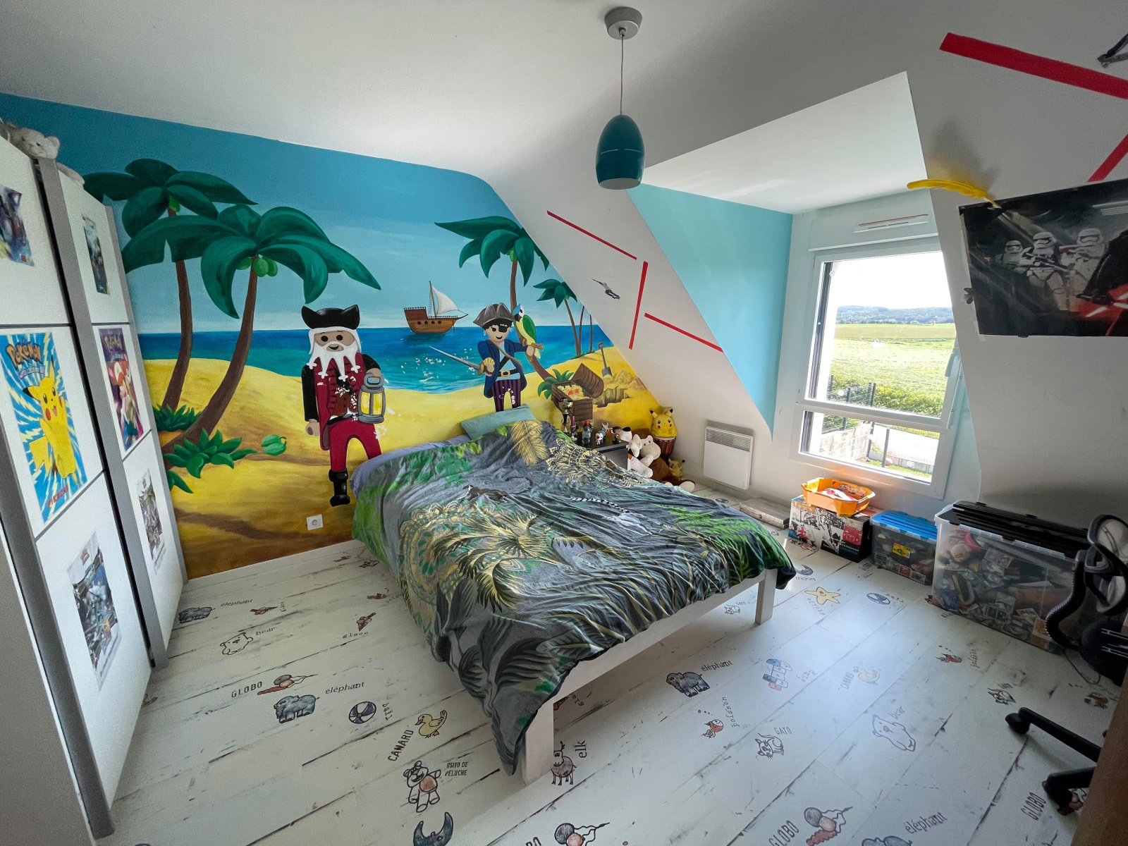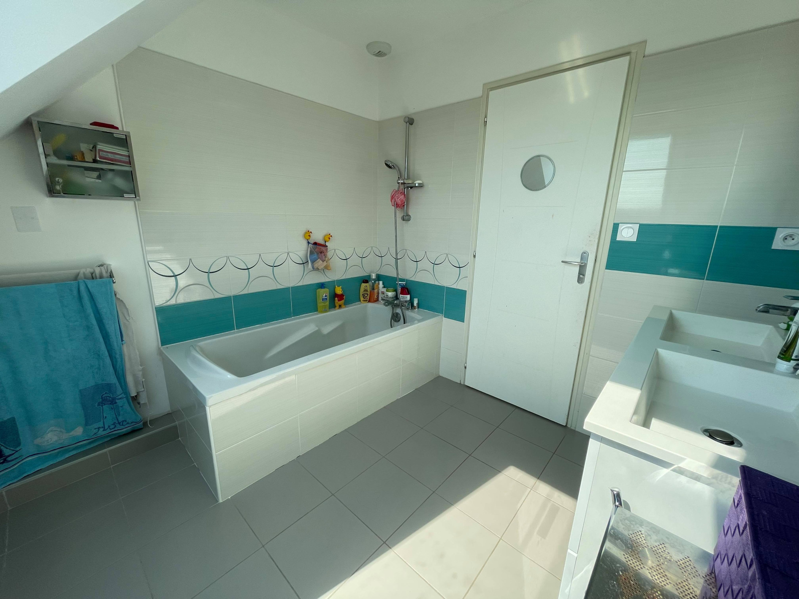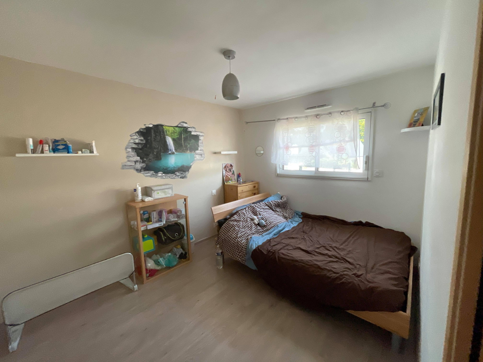 A l’étage : Trois chambres, un bureau, une salle de bain et un WC.