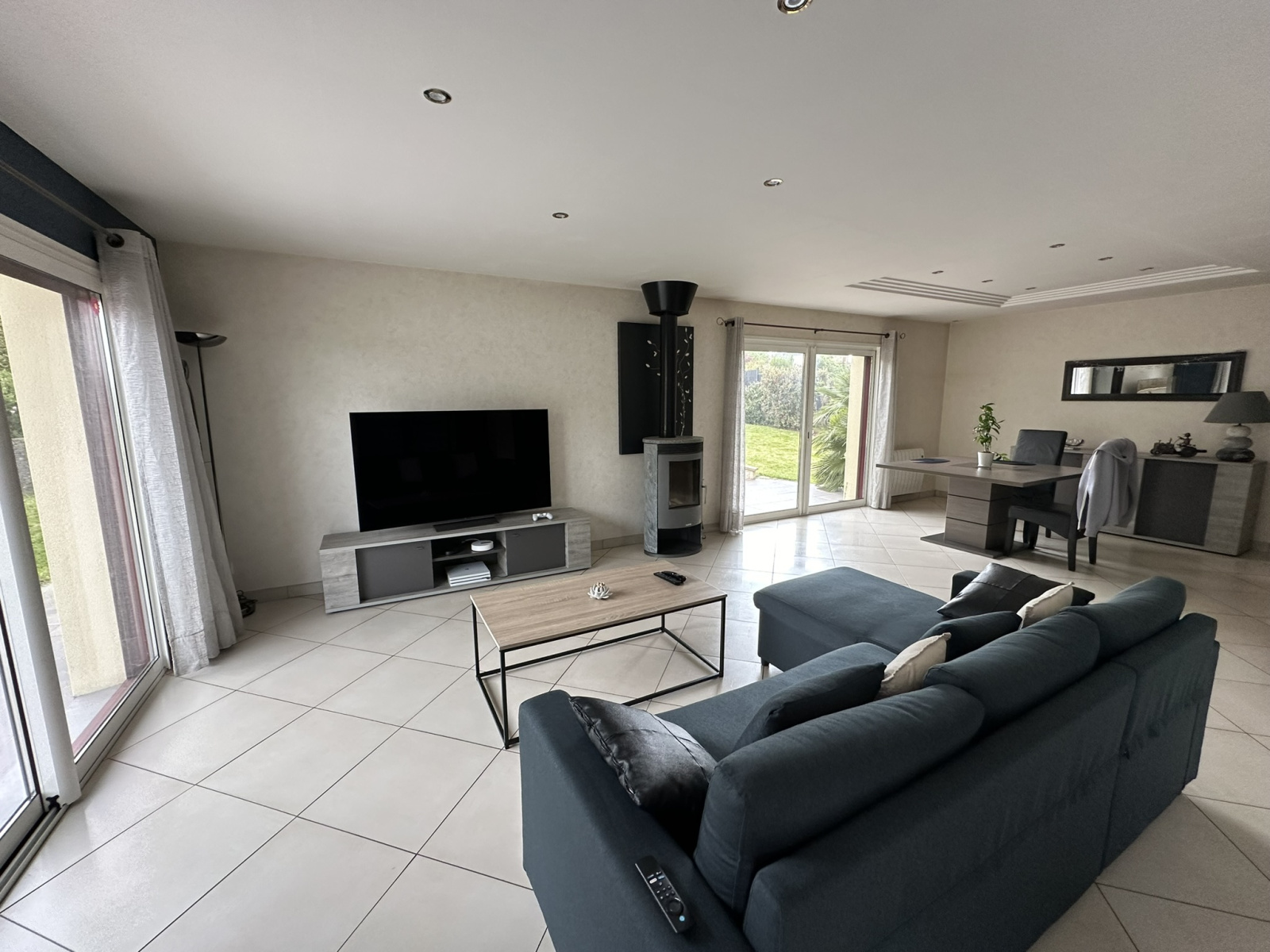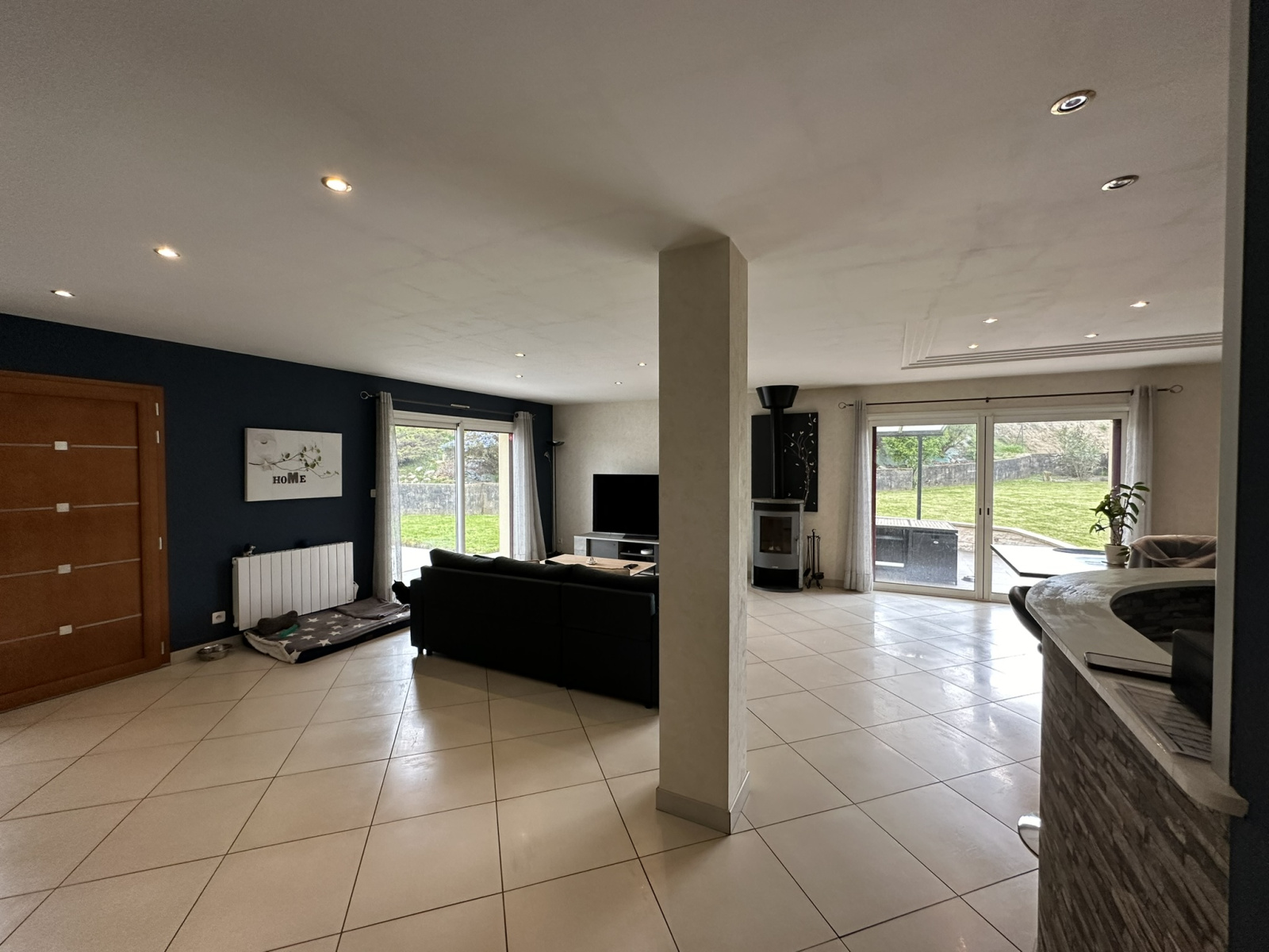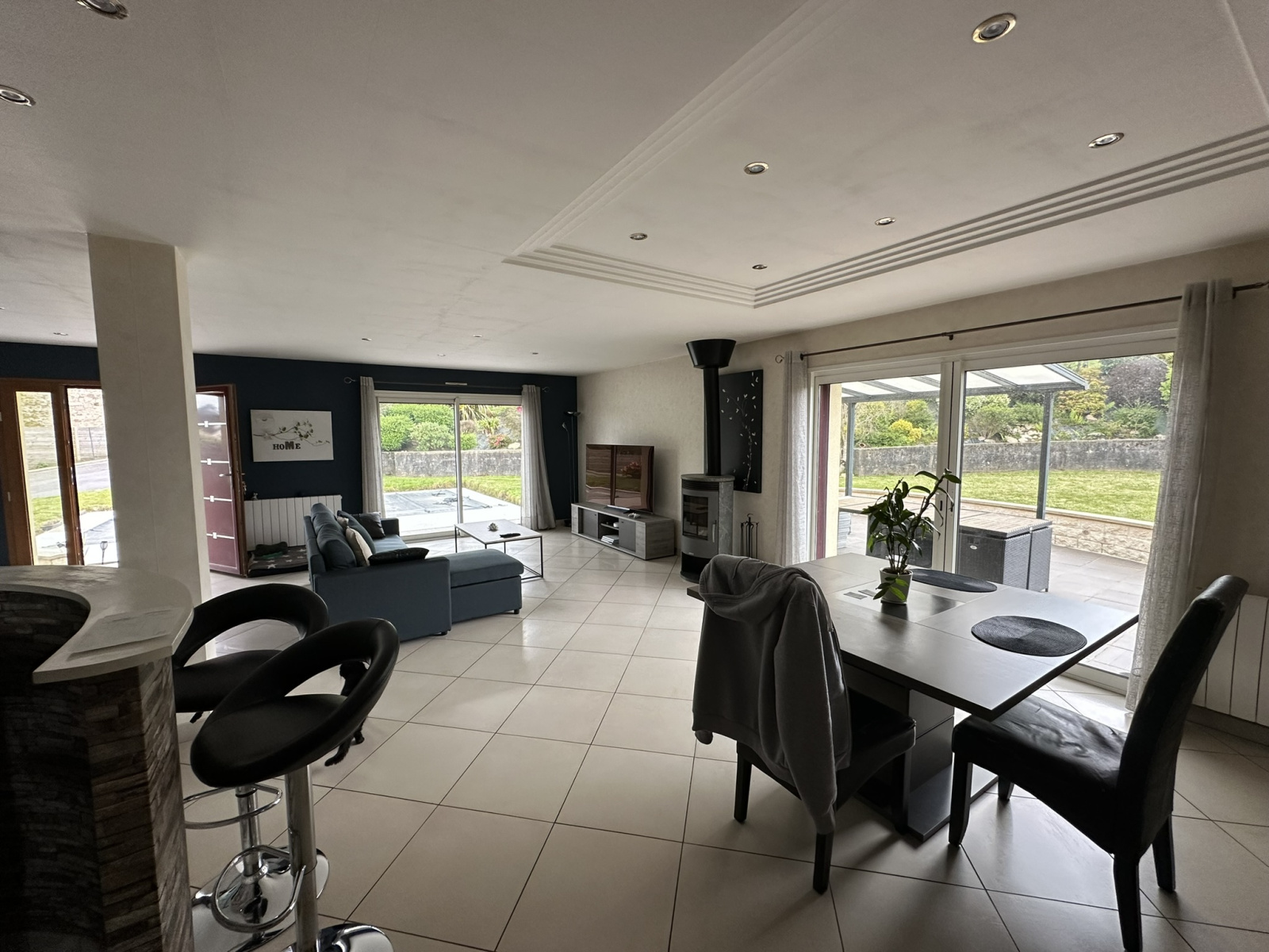 Au rez-de-chaussée : une entrée avec placard, une pièce de vie salon avec poêle à bois, salle à manger de plus de 50m², une cuisine aménagée et équipée, un cellier, deux belles chambres dont une avec dressing, une salle d'eau avec baignoire balnéo, une pièce bureau.