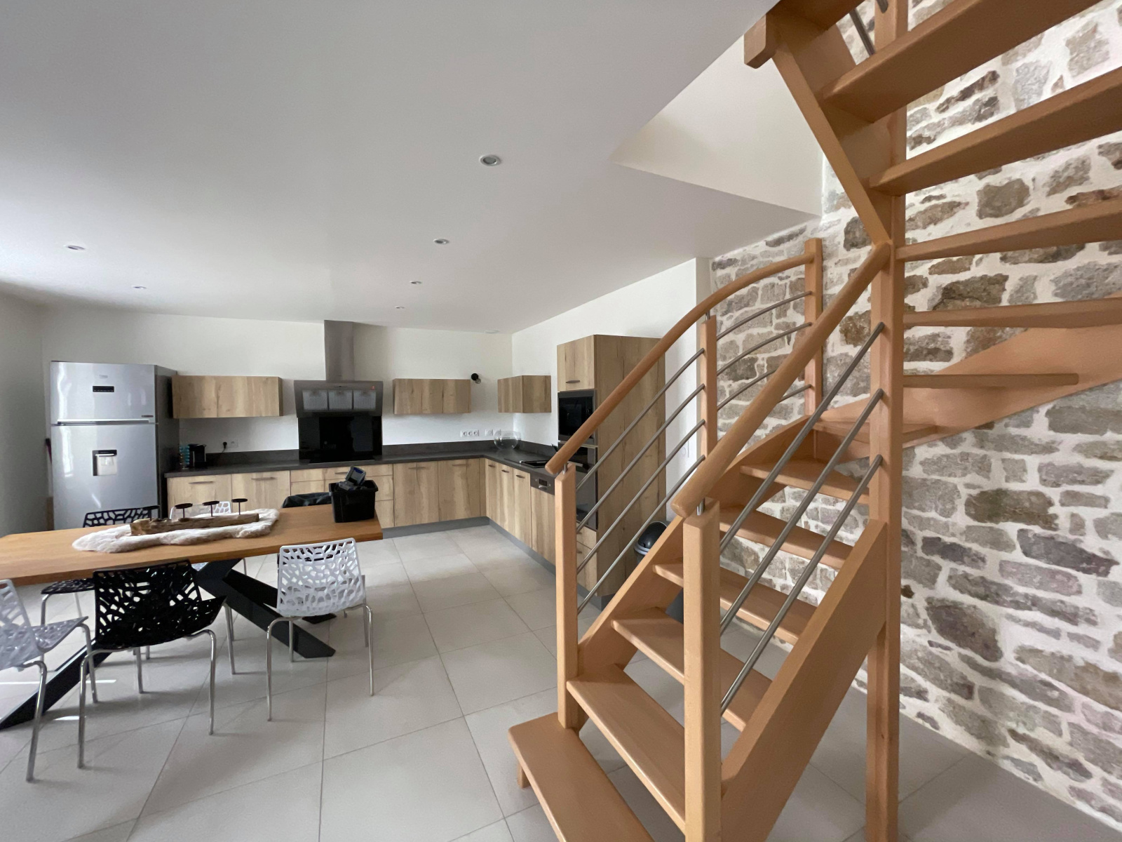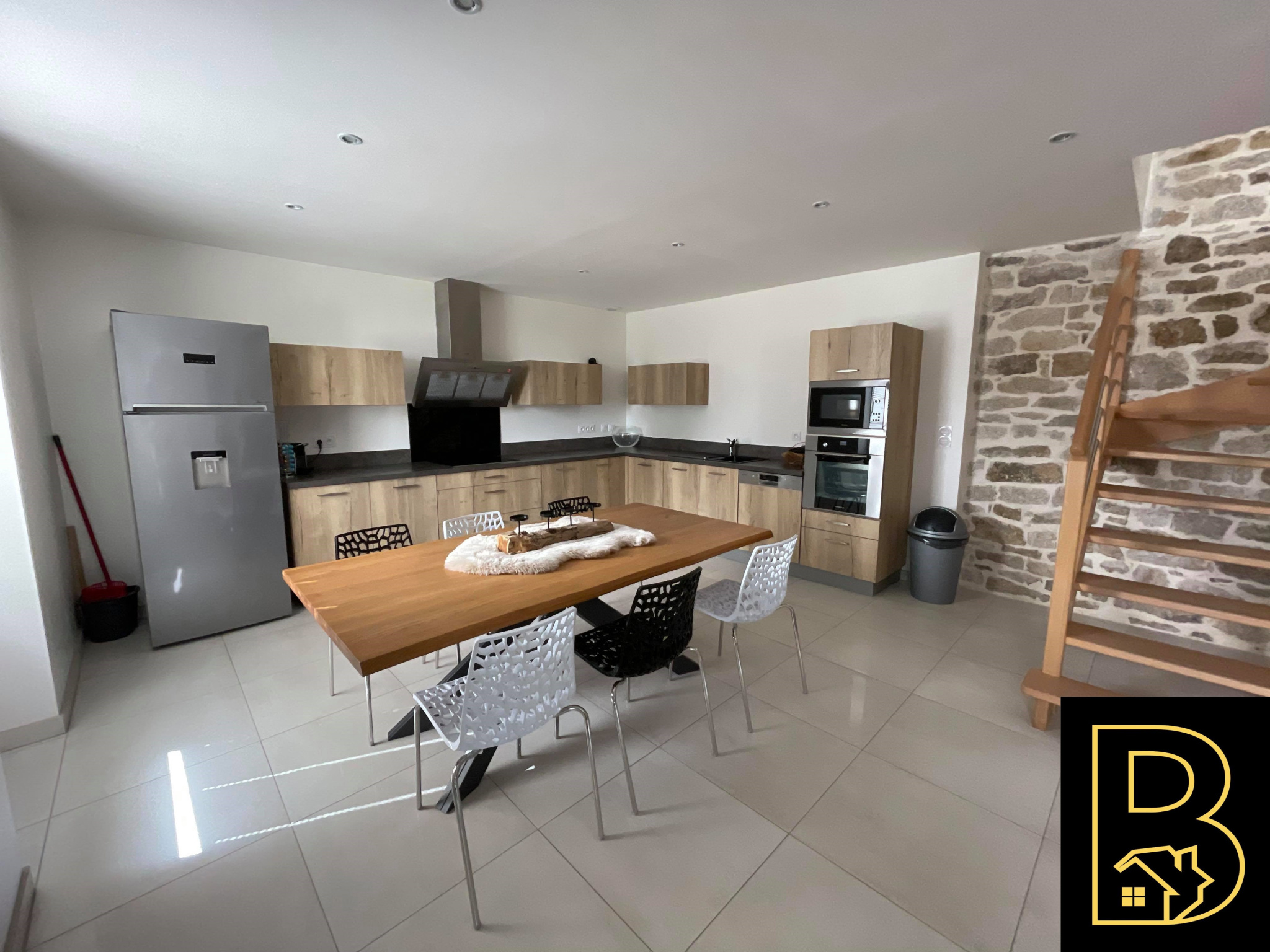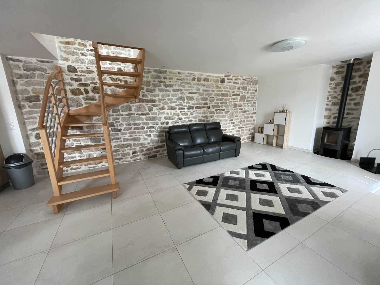 Une belle pièce lumineuse, une cuisine aménagée et équipée, un séjour/salon avec poêle à bois.