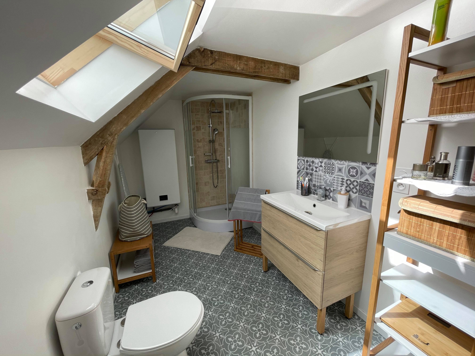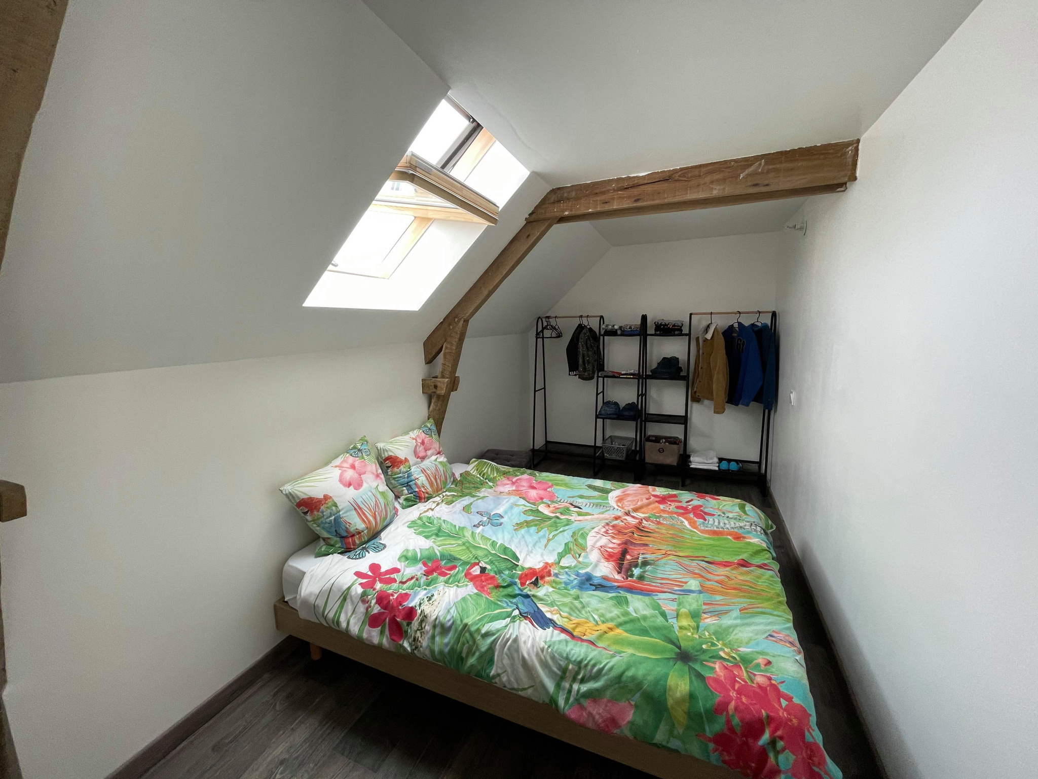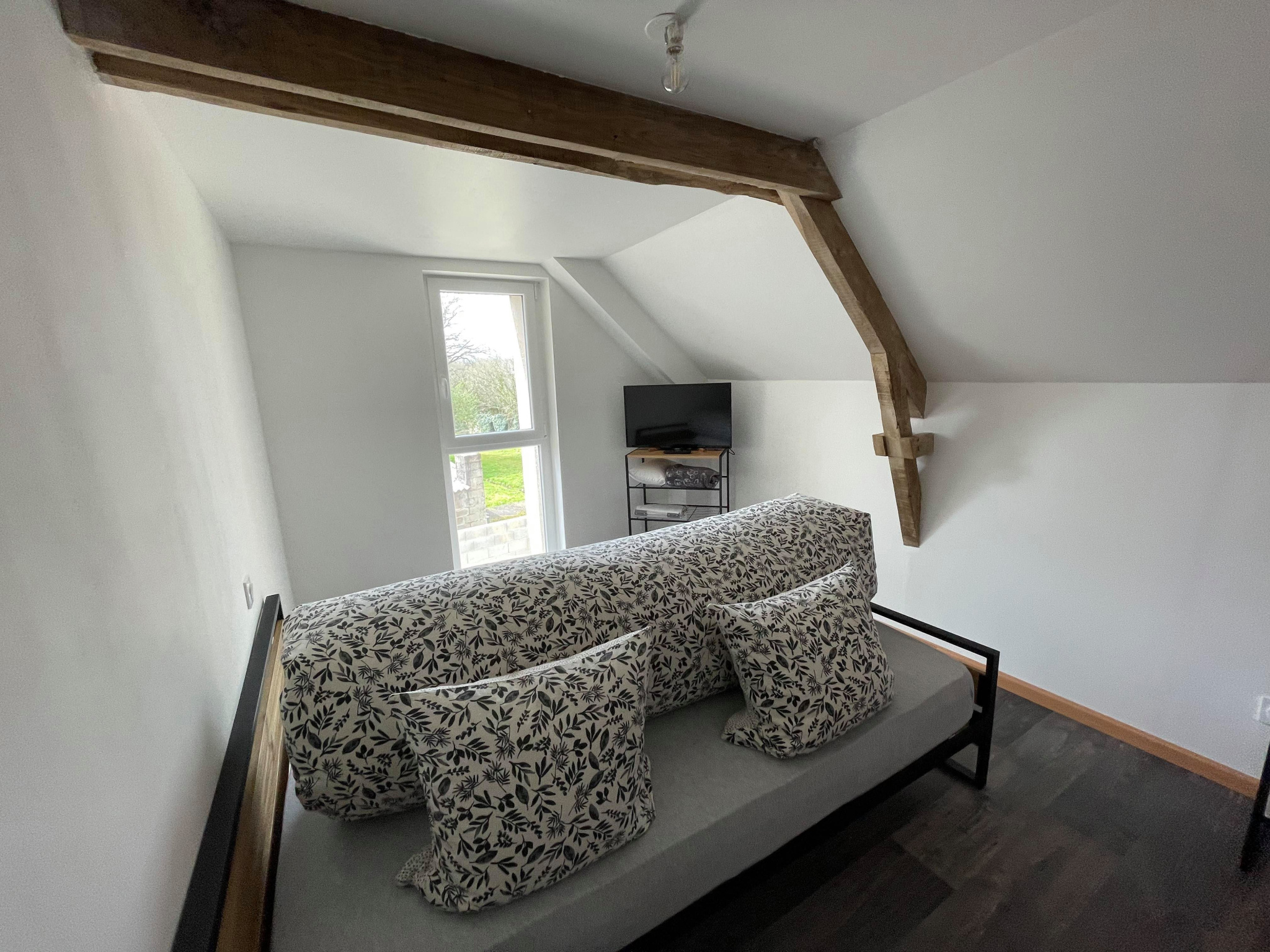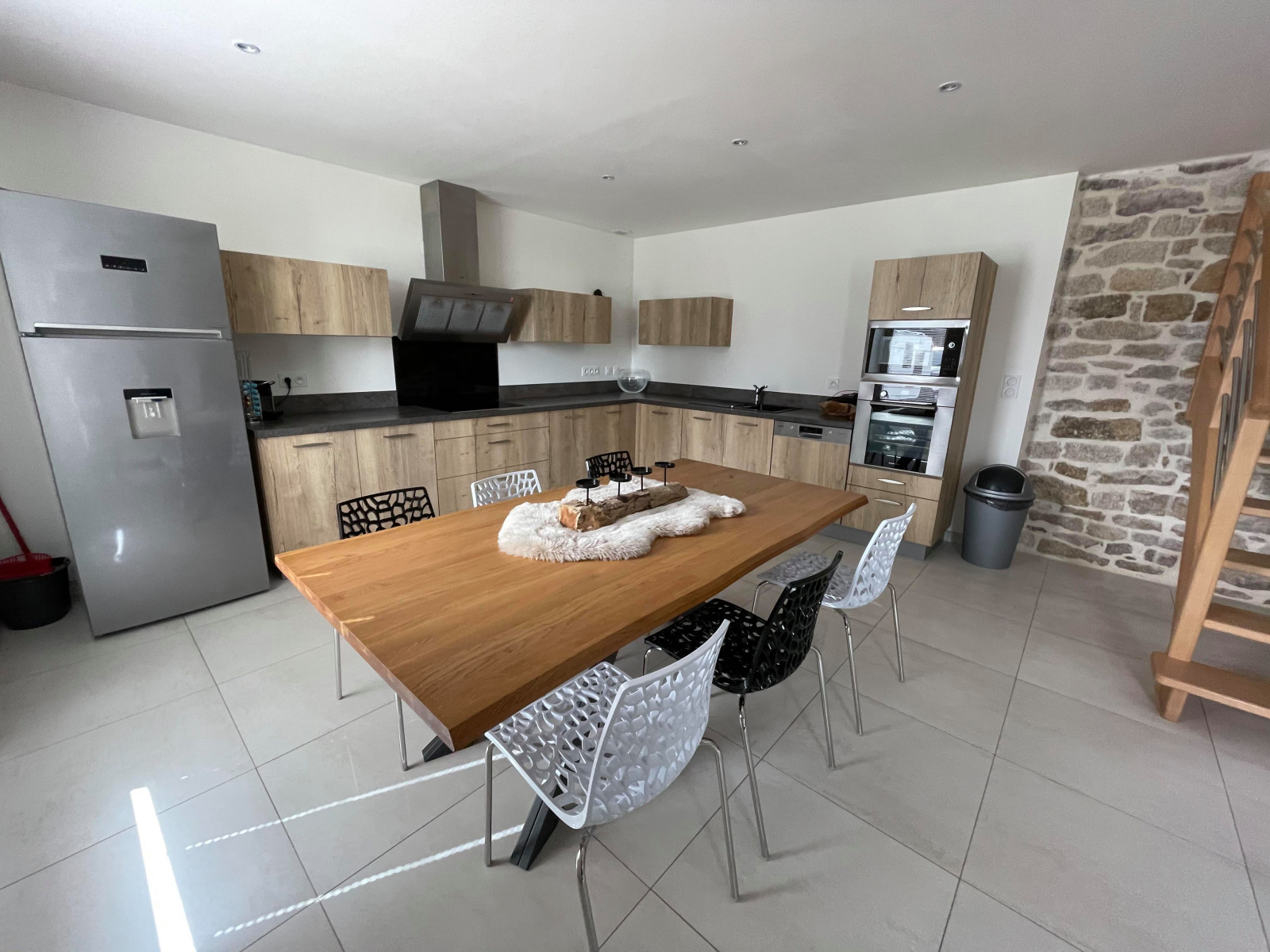 Une belle pièce lumineuse, une cuisine aménagée et équipée, un séjour/salon avec poêle à bois.