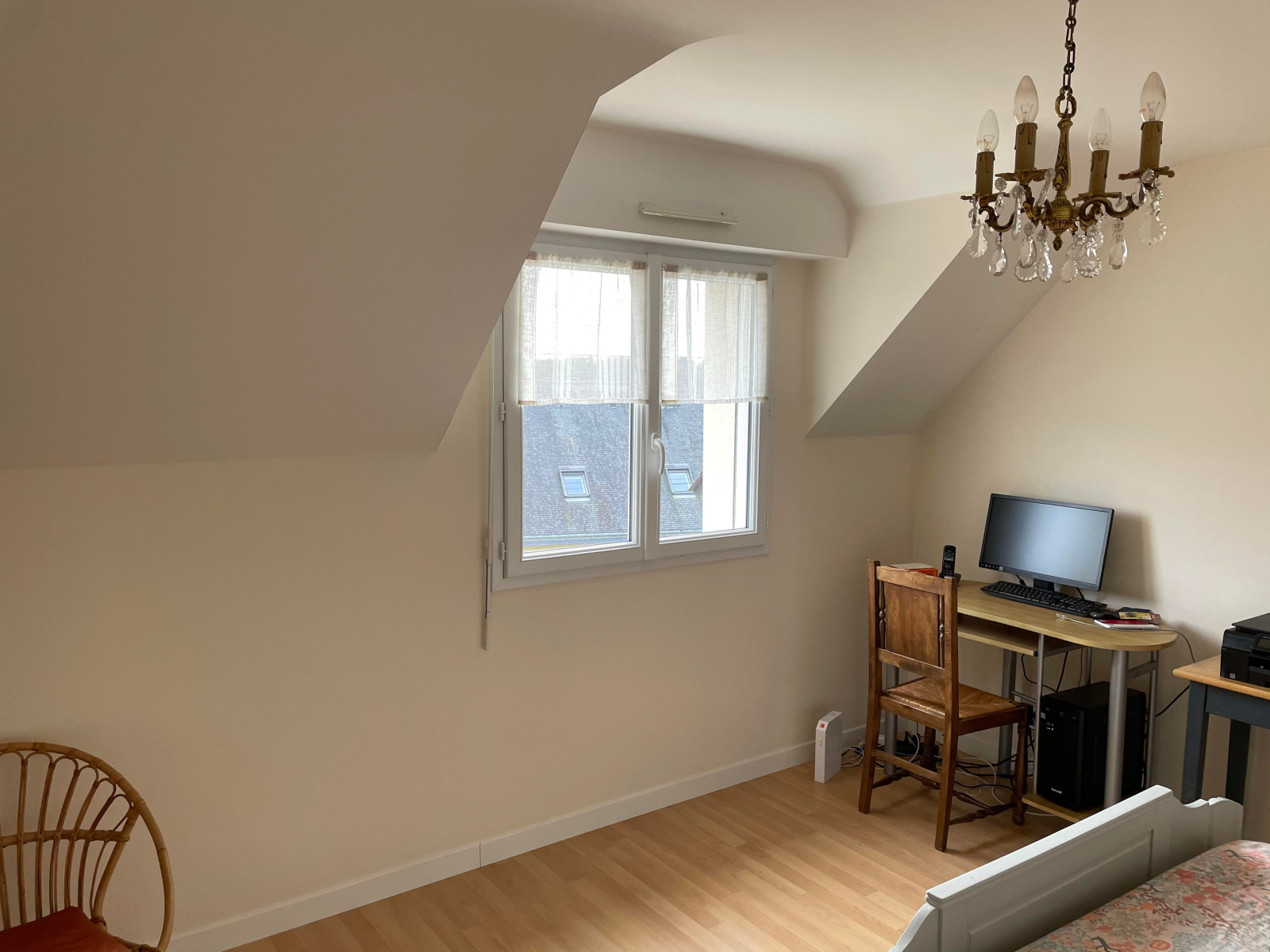 Au rez-de-chaussée : Un hall d'entrée avec placard, une cuisine aménagée et équipée, une salle à manger/salon exposée plein sud avec une vue dégagée, une grande et lumneuse chambre, une salle d'eau, un bureau et un WC.