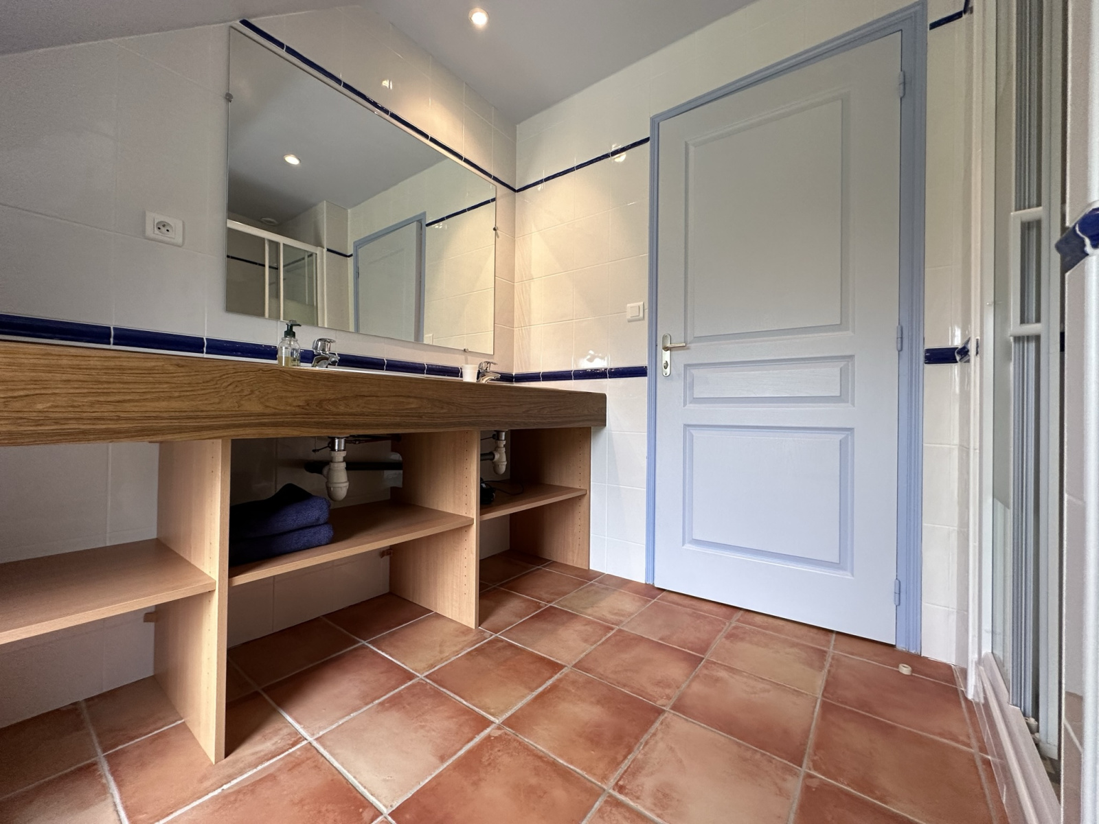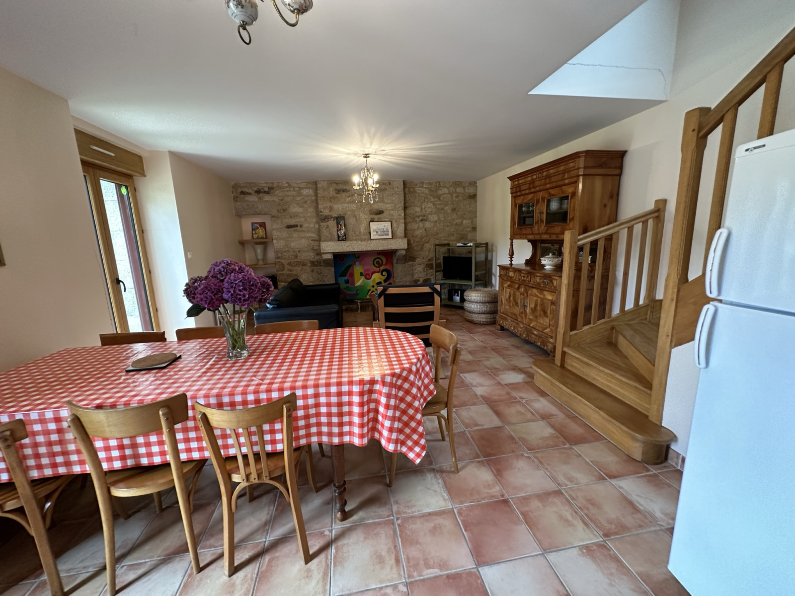 Rez-de-chaussée : pièce de vie avec cuisine ouverte, séjour/salon, une chambre avec salle d’eau privative, WC, buanderie.