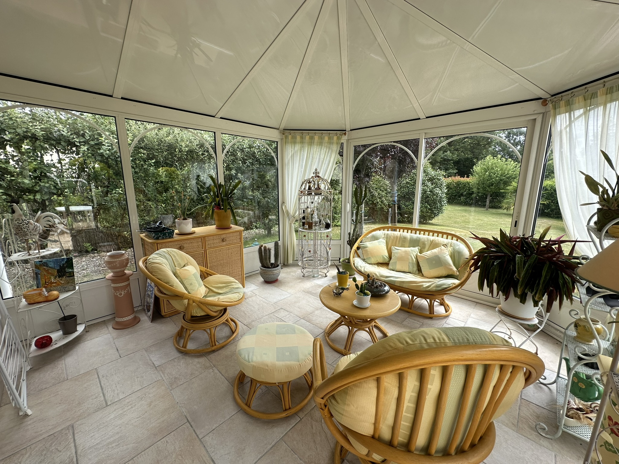 La pièce principale s’ouvre sur une superbe véranda donnant accès à une terrasse bien exposée, équipée d’un store banne, parfaite pour profiter pleinement des extérieurs toute l’année.