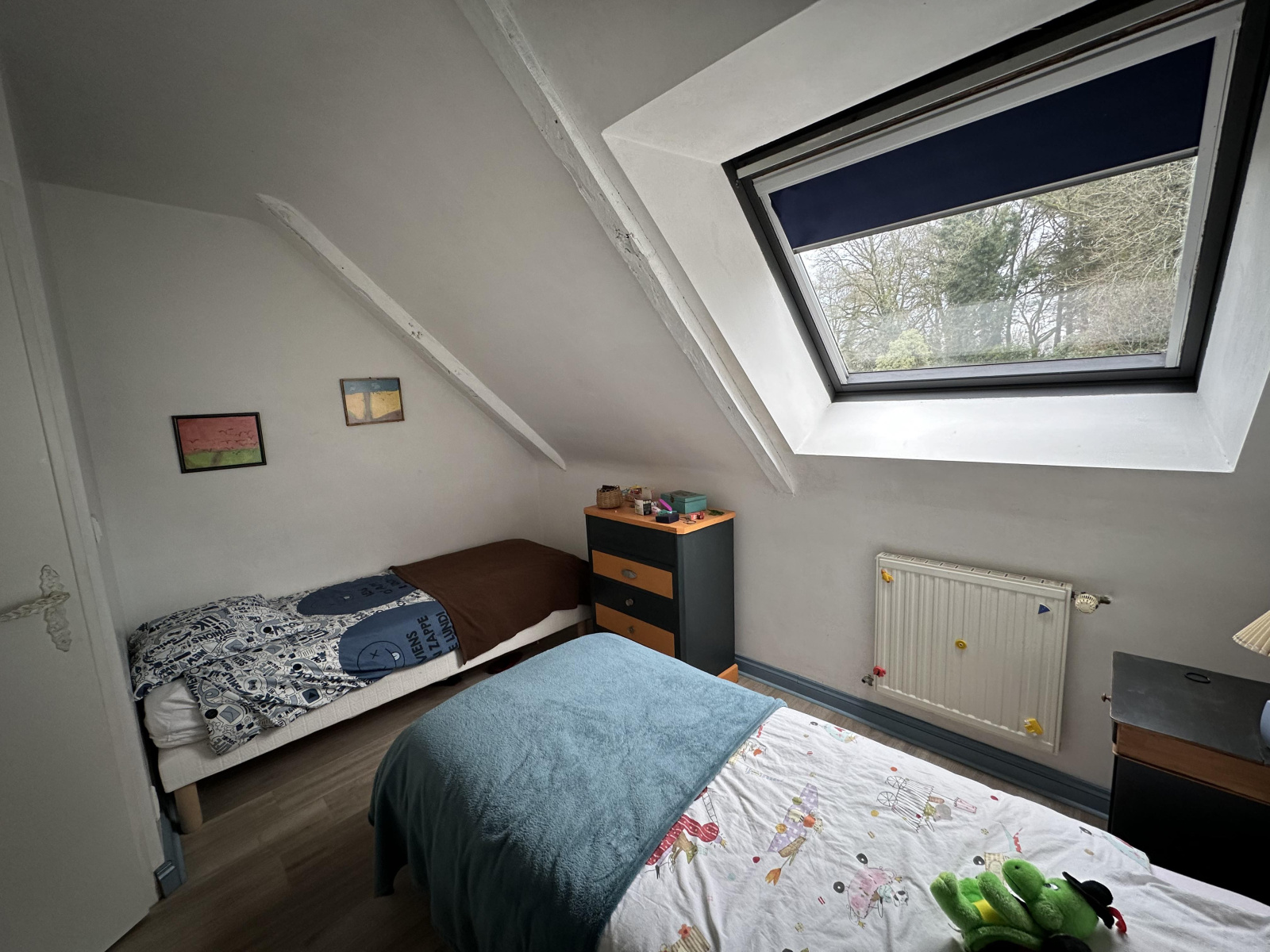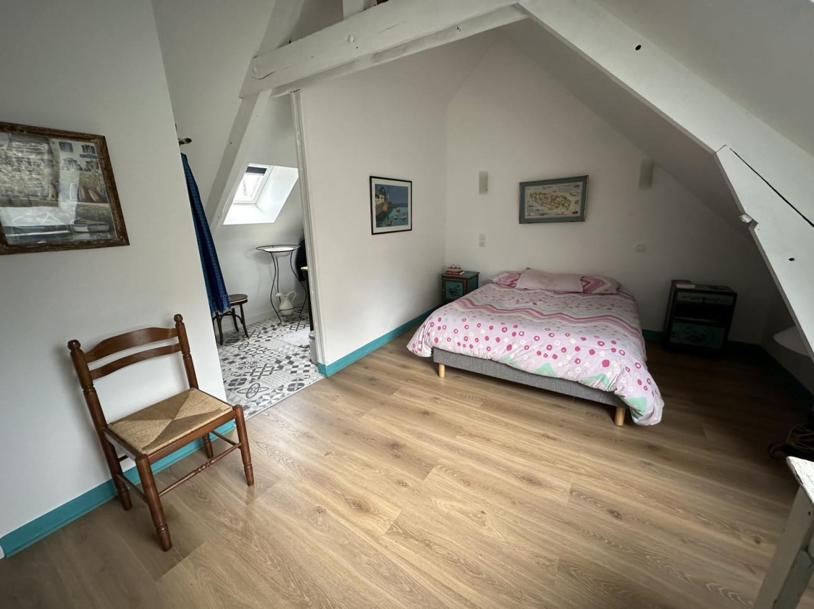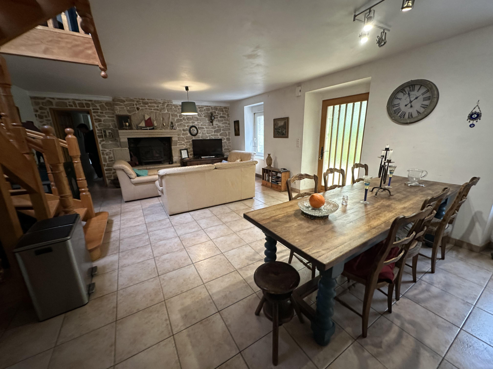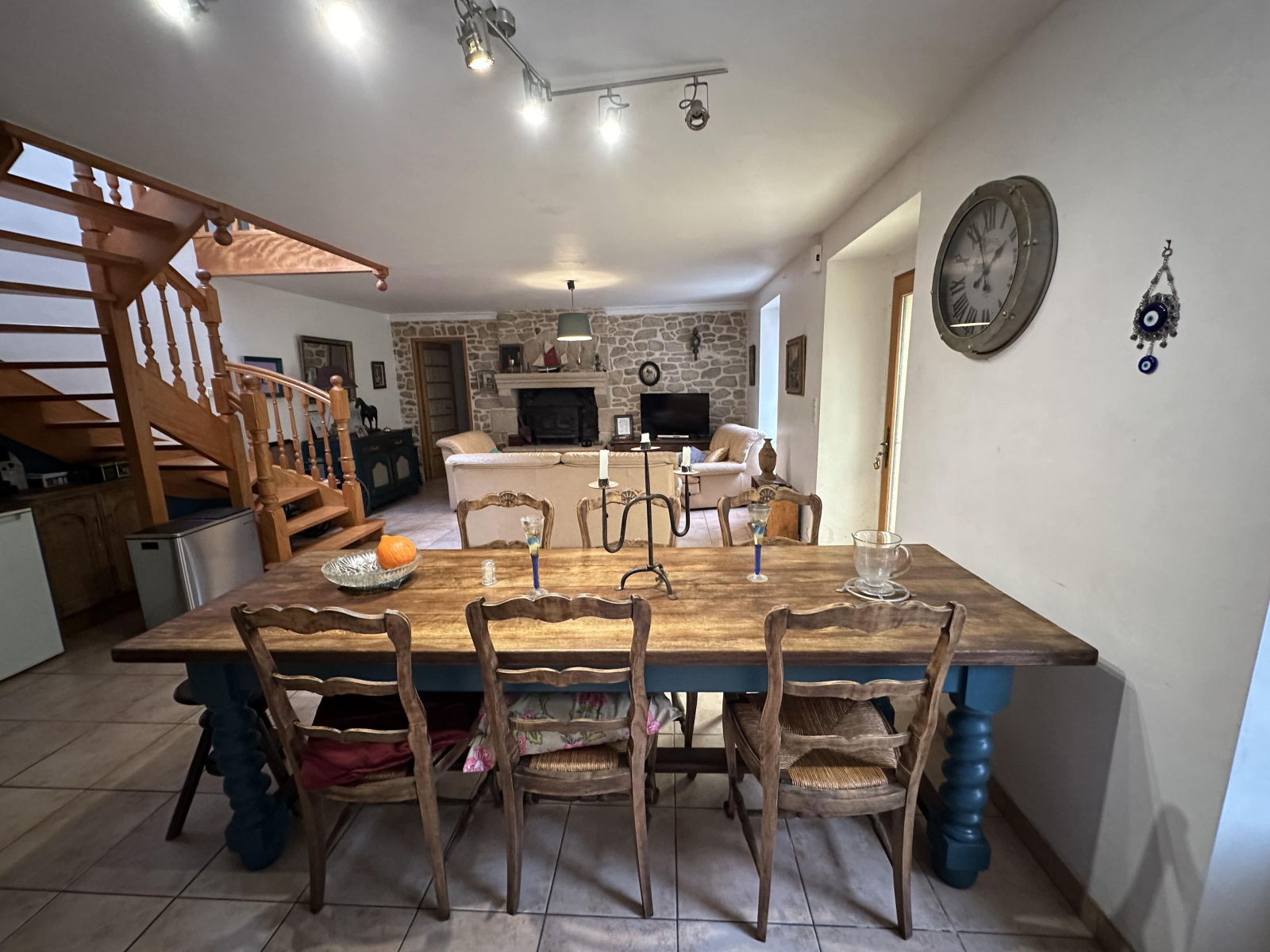 Salle salon cuisine avec cheminée, deux chambres, un WC, une salle d'eau, une chaufferie