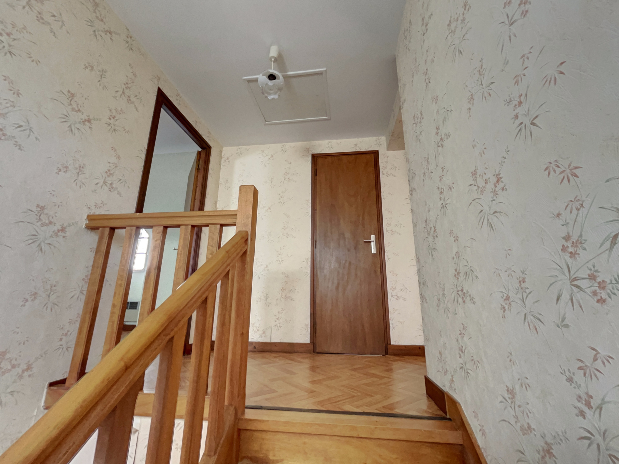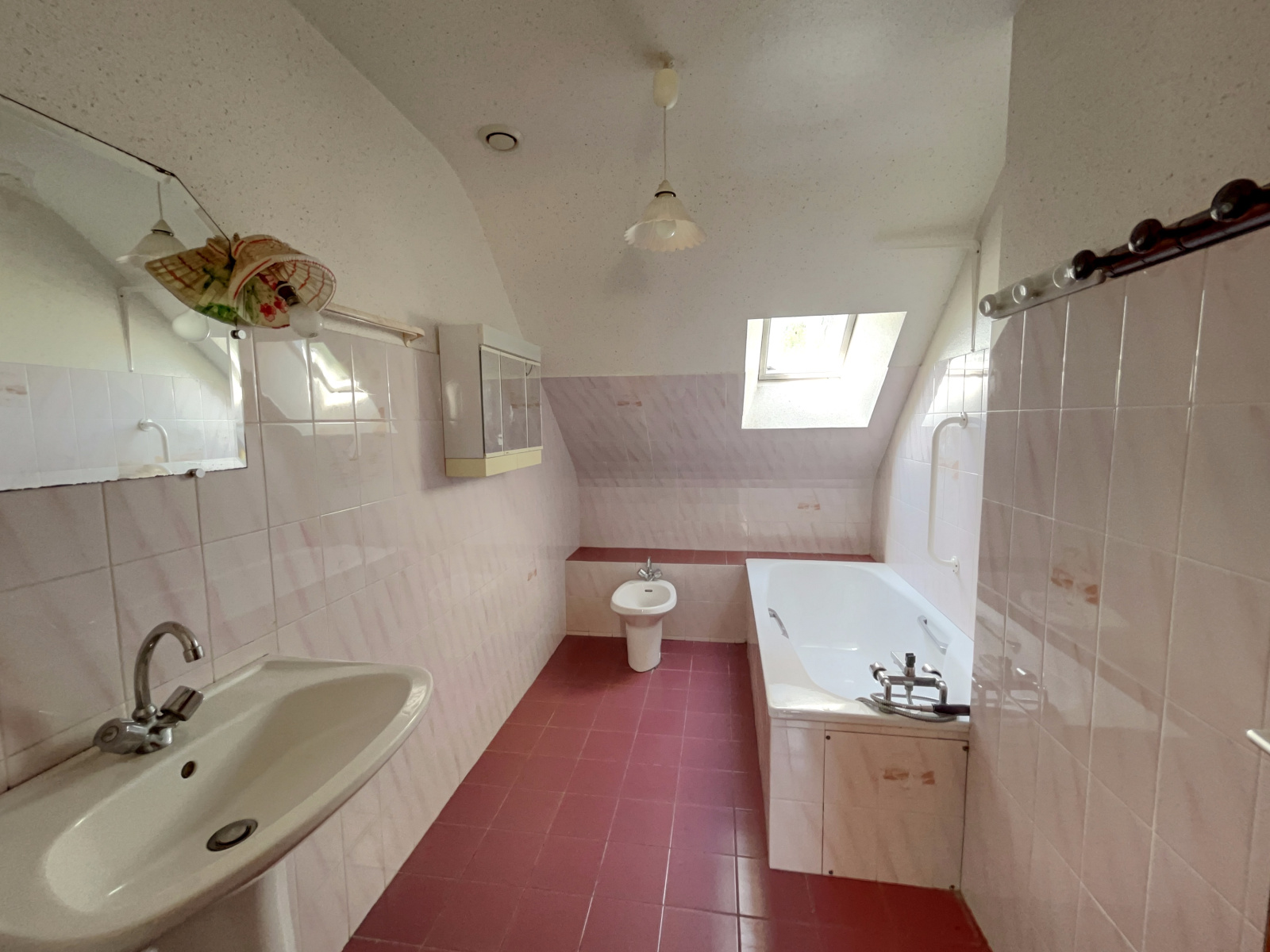 À l’étage : deux chambres, salle de bains, WC, dégagement et placards.