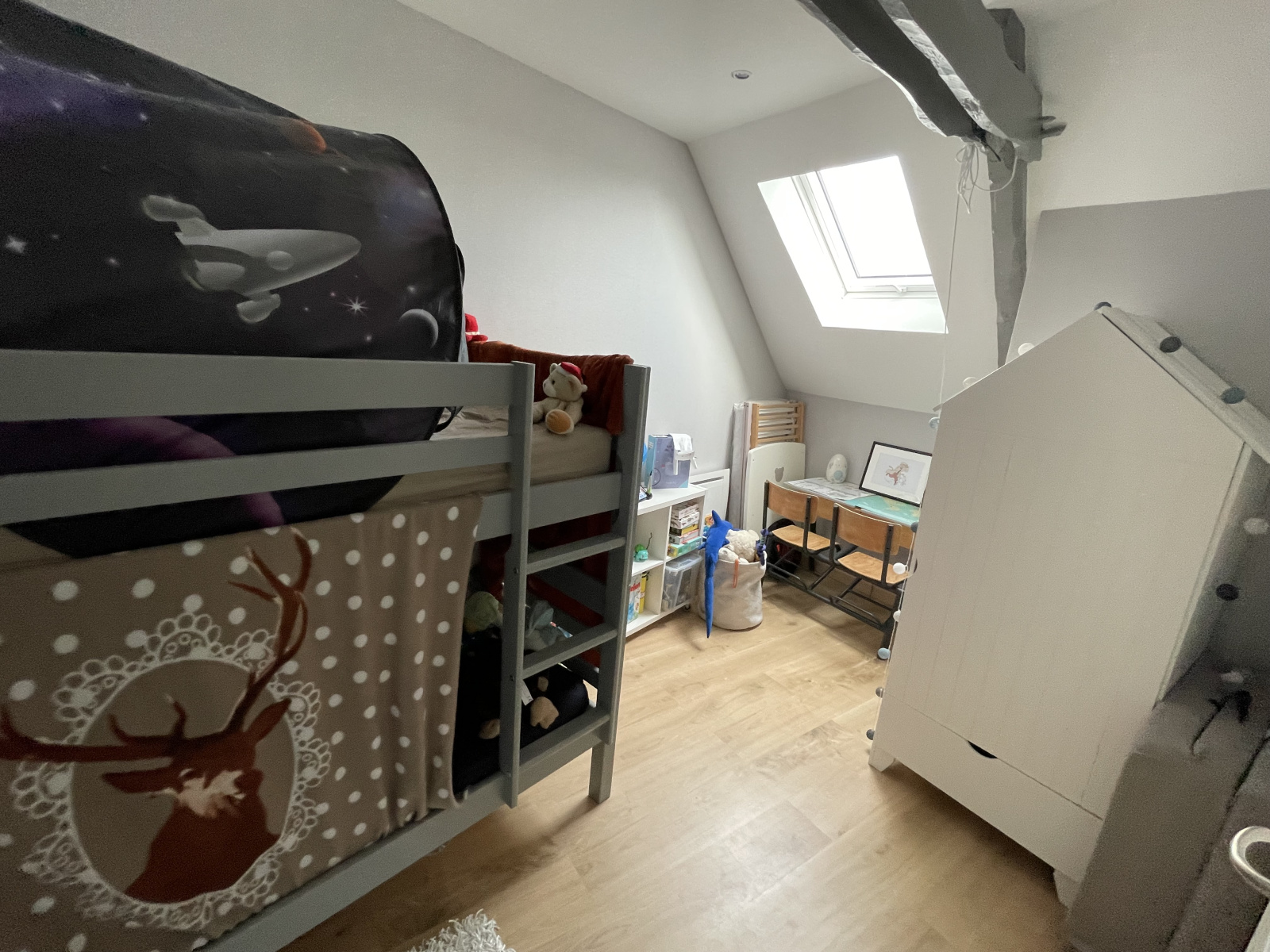 A l'étage : Deux escaliers, dont un desservant deux chambres et une salle d'eau avec wc, un autre escalier desservant la suite parentale avec salle d'eau.