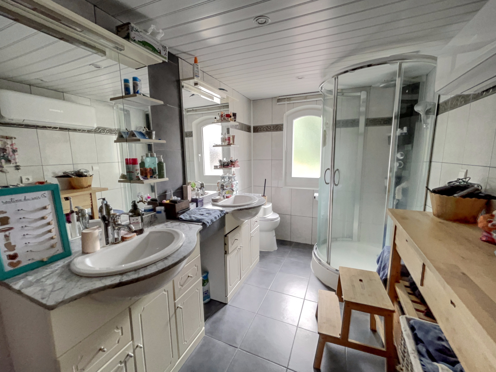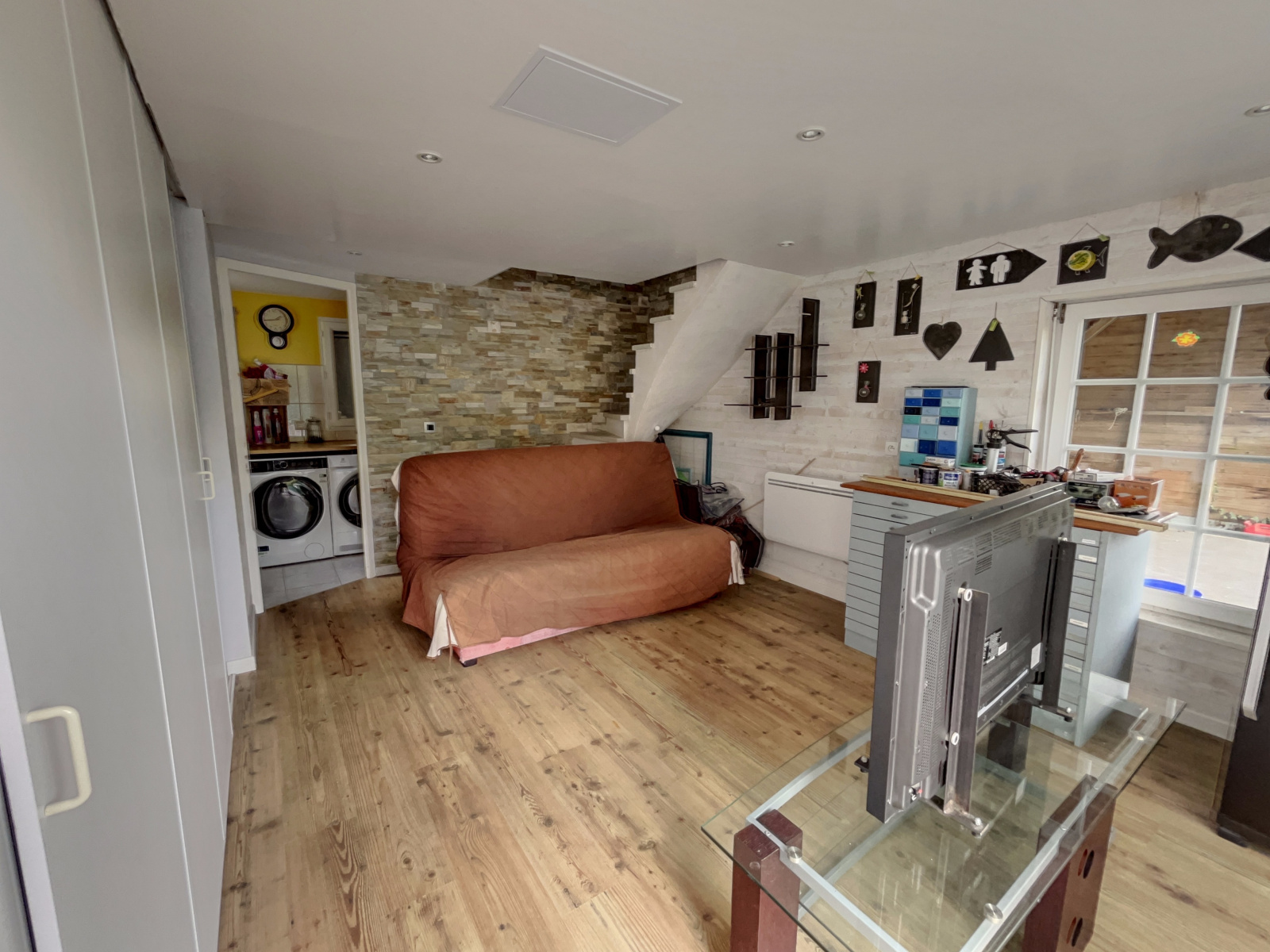 La maison principale se compose au rez-de-chaussée d’une entrée accueillante, d’une belle pièce de vie avec cuisine ouverte aménagée, d’un salon chaleureux agrémenté d’un poêle à bois, d’un bureau idéal pour le télétravail ainsi que d’une salle d’eau et d’une véranda