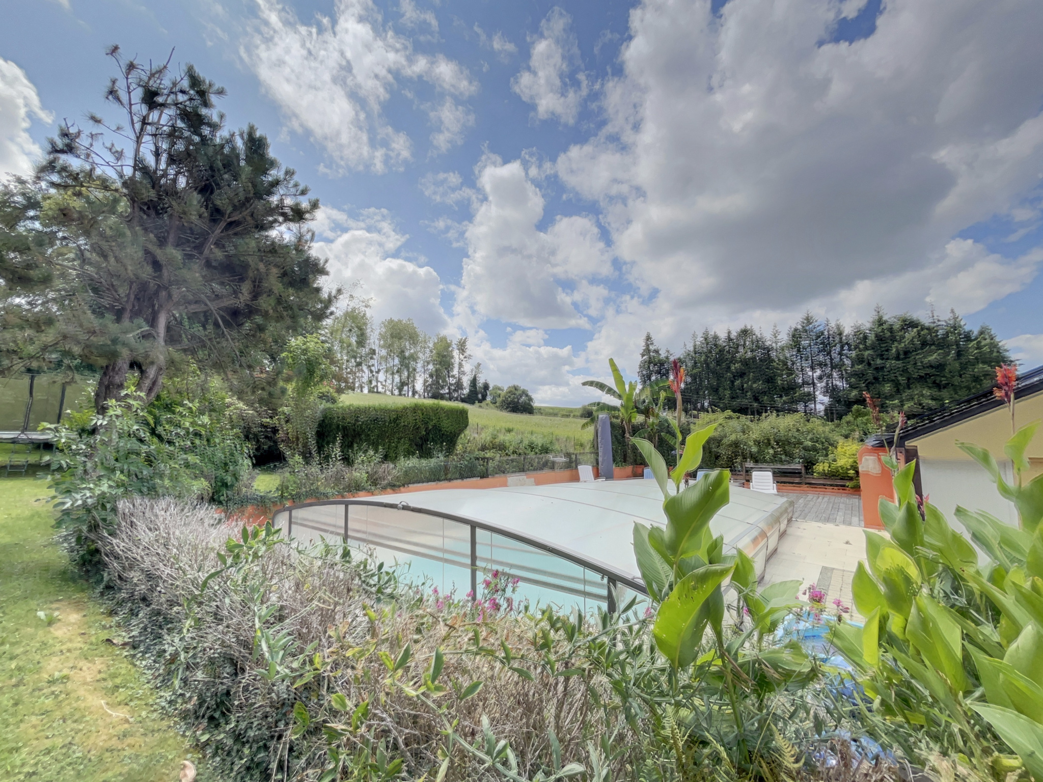 Pour votre confort, la propriété dispose également d'une piscine couverte et chauffée par pompe à chaleur. Le jardin arboré et fleuri vous invite à la détente avec notamment une roseraie.