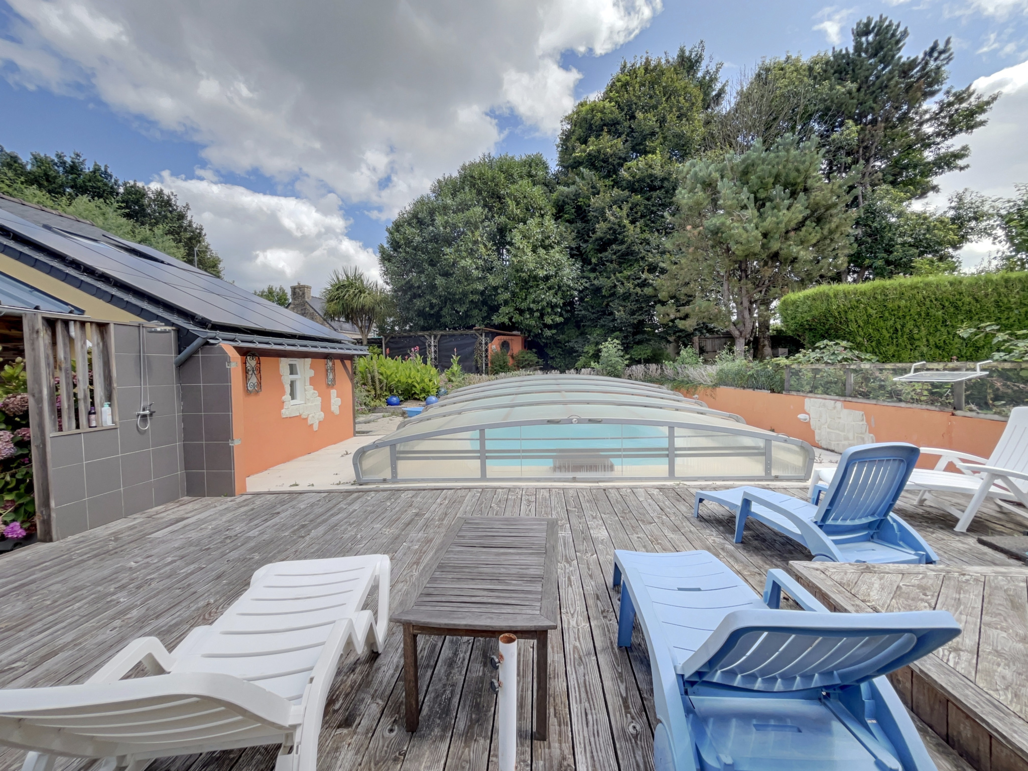 À l’extérieur, plusieurs terrasses vous permettront de profiter pleinement des beaux jours. Une dépendance aménagée offre un espace de vie supplémentaire comprenant une cuisine, une chambre, une pièce de vie, une salle d’eau et un WC — idéal pour accueillir famille, amis ou pour une activité de gîte.
