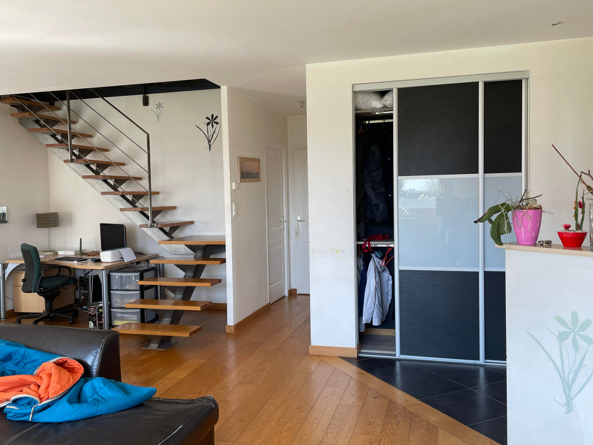 A l'étage: Une mezzanine desservant 3 chambres dont une de 28m², une salle de bain, un WC.