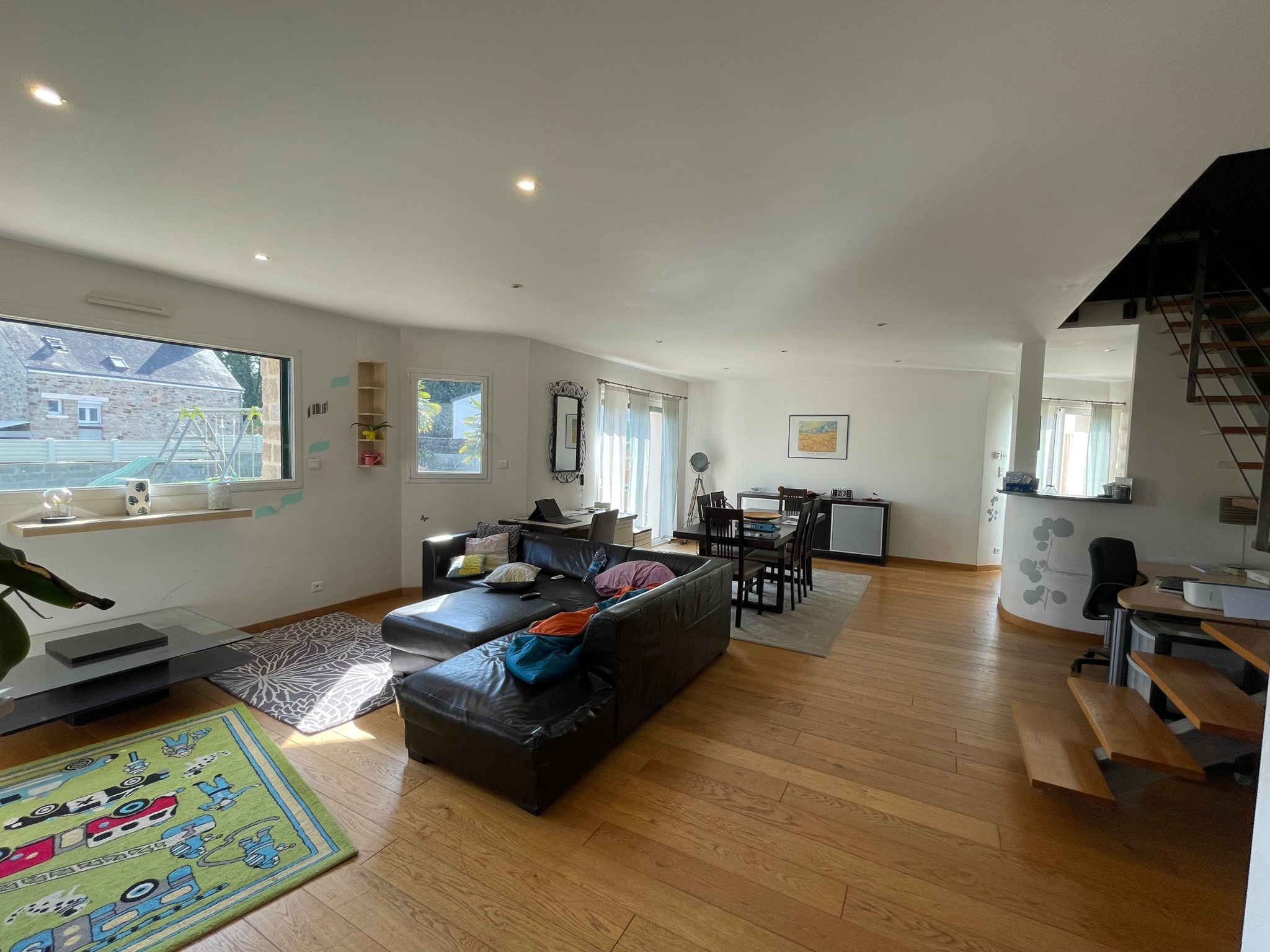 Au rez-de-chaussée: un hall d'entrée, une grande pièce de vie de 55m² ,salon, salle à manger, cuisine amenégée et équipée, une buanderie. Une chambre, salle d'eau et un WC.